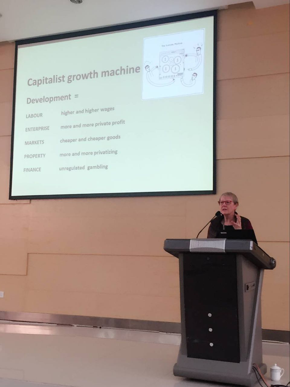 首先,经济学院(会计学院)党委书记梁双陆上台为大家介绍了远道而来的凯瑟琳.吉布森教授。她于2005年被选举获得澳大利亚社会科学院院士荣誉,现为西悉尼大学文化与社会研究所教授研究员。作为国际地理、经济和社会科学相关研究领域的重要领军者,30年来致力于开设灵活而具有生命的经济研究和政策改进,并著有《资本主义终结》、《后资本主义政治》、《道德导向的社区经济转型》和《创造另一种可能的世界》等著作。