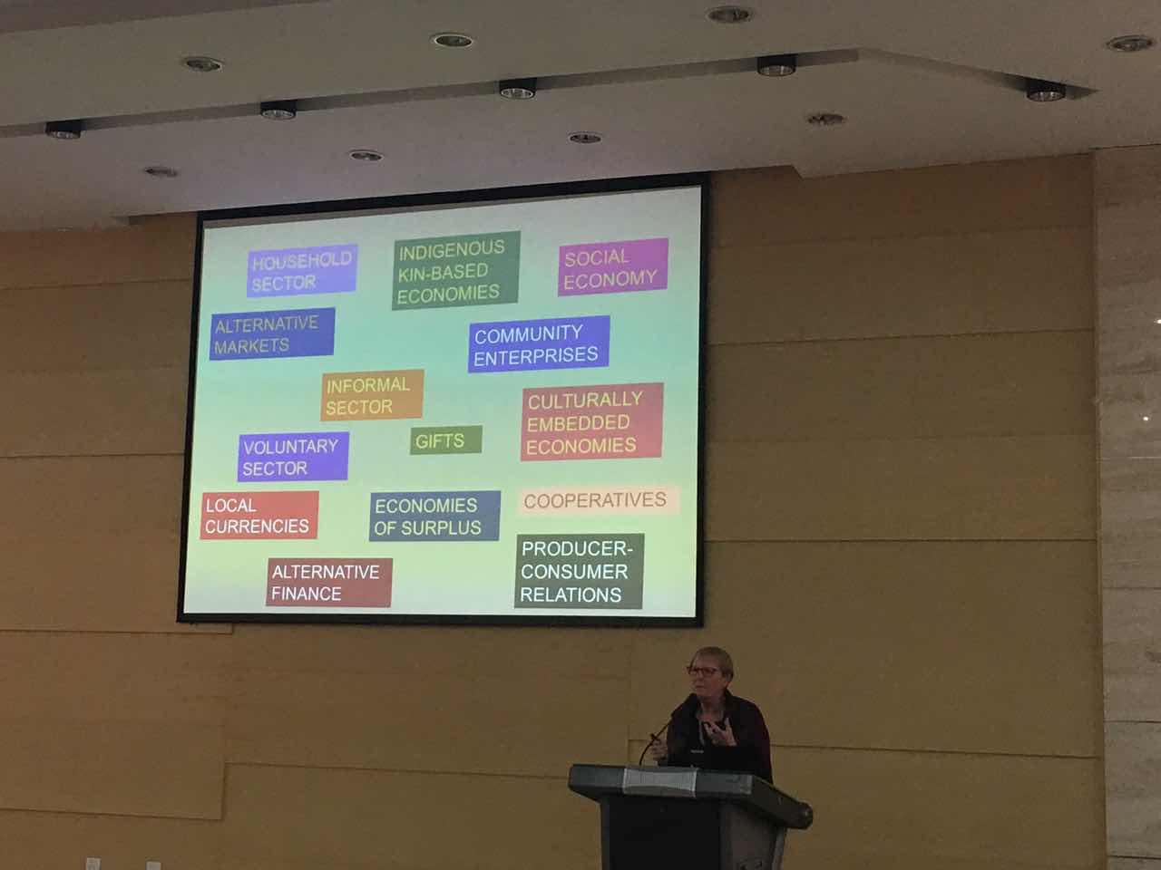 接下来吉布森教授用流利的英语带来了历时一个半小时的精彩报告,她主要讲述了在经济生态中恢复力的重要性。吉布森教授在自己的报告中运用众多贴近生活的中外实例及现实数据来佐证自己的观点,整个报告既生动又简单易懂。吉布森教授清晰的口语使台下的听众如痴如醉,受益匪浅,丝毫未受到语言不同的影响。