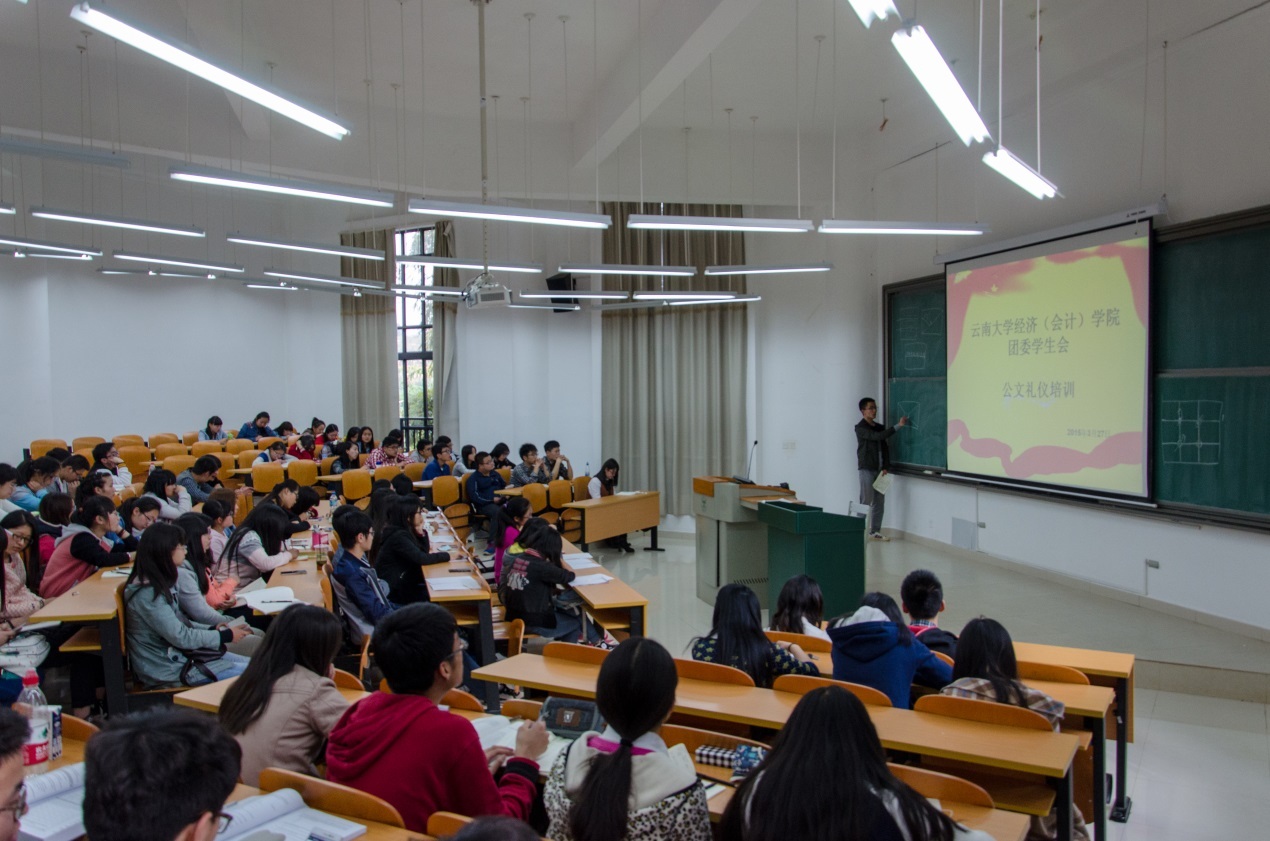 3月27日,经济(会计)学院团委学生会在力行楼1205教室,隆重举办2015学期内部培训大会,出席此次大会的有云南大学经济(会计)学院团委副书记王晨哲同学、学生会副主席赵雪霏同学、各部门中层代表及全体学生会干事。