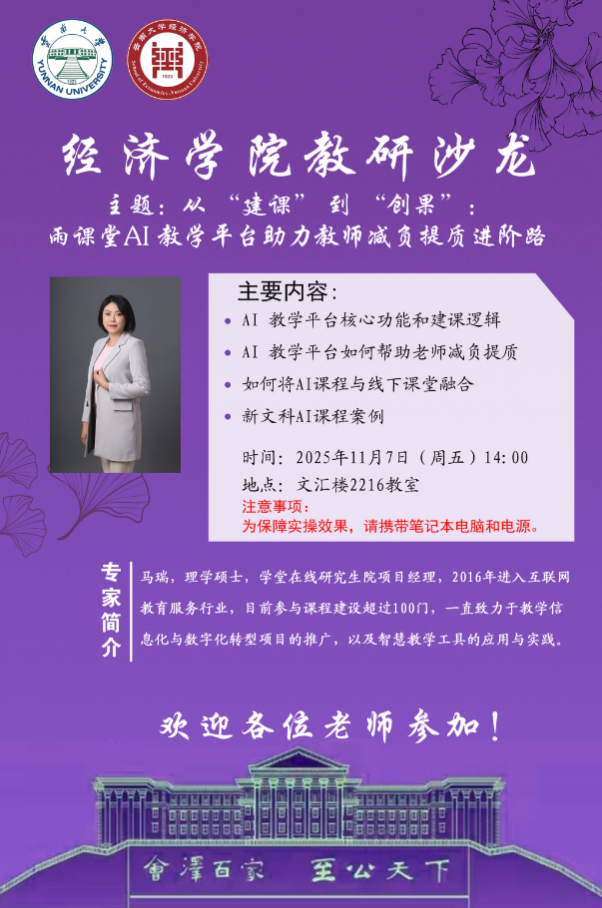 2025年11月7日,云南大学经济学院在文汇楼2216智慧教室举办以“从‘建课’到‘创果’:雨课堂AI教学平台助力教师减负提质进阶路”为主题的教研沙龙。此次教研沙龙特邀学堂在线项目经理马瑞参加。马瑞经理长期从事互联网教育服务相关工作,参与建设课程超过100门,致力于教育信息化和数字化转型项目的推广和智慧教学工具的应用与实践。
