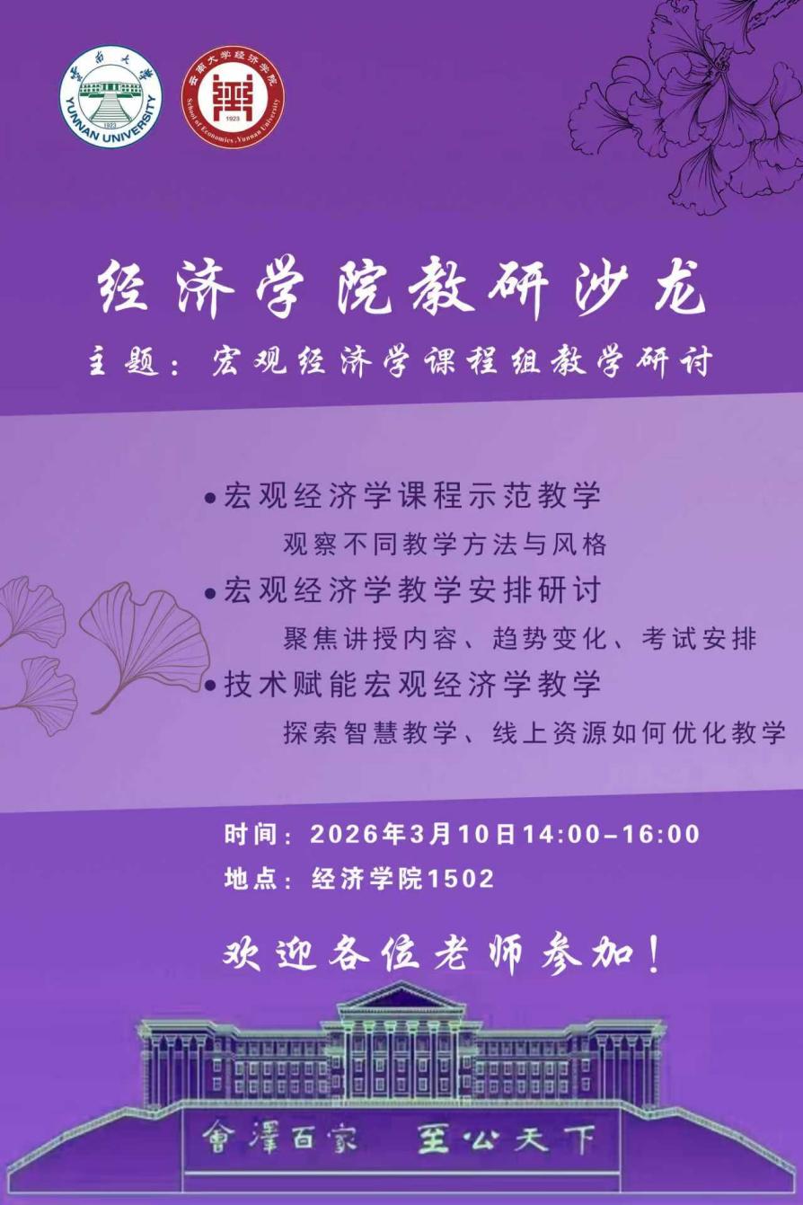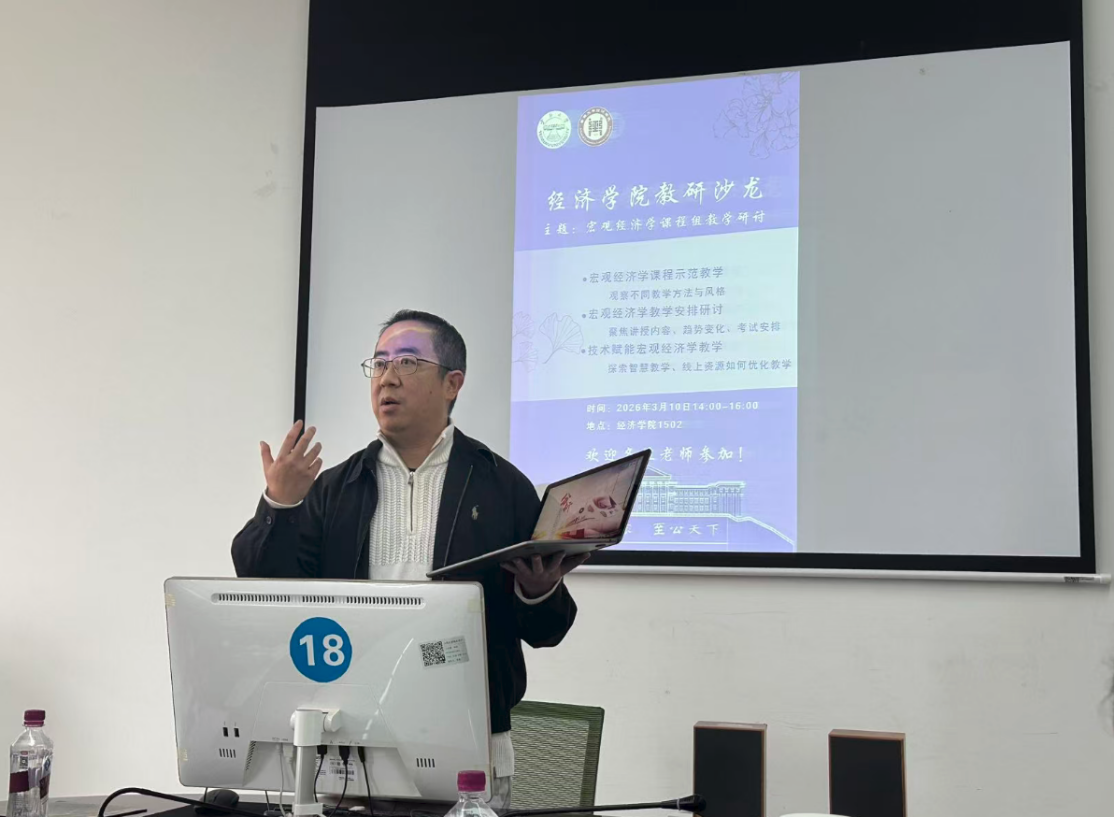 为进一步提升本科教学质量,深化宏观经济学课程教学改革,经济学院宏观经济学课程组于3月10日下午在学院1502教室顺利举行2026年春季学期第一次教学研讨会。研讨会由宏观经济学课程组组长吴明主持,宏观经济学课程组全体教师,经济学院院长张林,副院长马子红、周观琪,以及经济学院、商旅学院多位教师全程参与研讨交流。