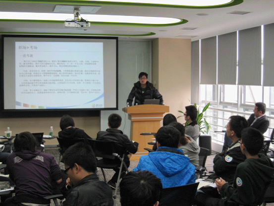 随后,腾讯公司区域拓展部宋经理幽默、风趣地向我们阐述了“何为职场”、“如何更好地融入职场”等方面问题。他深入浅出的讲解使我们明白了在职场中,心态和能力同等重要。最后,我们被分为6个小组,进行了激烈的小组内与小组之间的讨论,大家唇枪舌战,慷慨激辩,思想火花的一次次碰撞使大家都感觉受益匪浅。